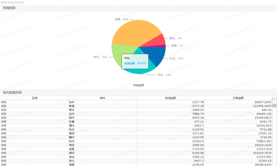 点击饼图上的 华东 区域,数据显示效果如下: