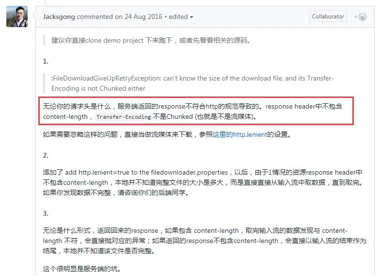 如果你遇到了: 'can't know the size of the download file, and its Transfer-Encoding is not Chunked either', 但是你想要忽略类似的返回头不规范的错误,直接将该关键字参数设置为true即可,我们将会将其作为chunck进行处理 然后我回到自己的项目中找到响应头中校验代码并做了如下修改