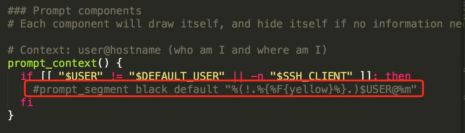 在代码prompt_segment black default "%(!.%{%F{yellow}%}.)$USER@%m"前加#号进行注释。