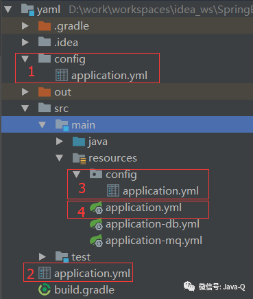 以上对application.yml文件的使用都是基于在classpath根路径下,即将application.yml文件放在resources目录下。Spring Boot支持从以下位置加载application.yml文件: