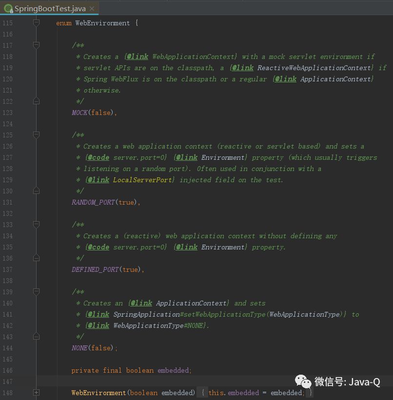 上面的单元测试类使用了@SpringBootTest注解,它是在1.4.0版本加入的单元测试辅助注解,使用这个注解会在单元测试执行的时候自动搜索@SpringBootConfiguration注解标注的启动类,进而启动Spring容器。@SpringBootTest注解的webEnvironment属性用于指定创建的ApplicationContext是否是WebApplicationContext,默认值是WebEnvironment.MOCK,即创建WebApplicationContext,具体源码如下图所示。