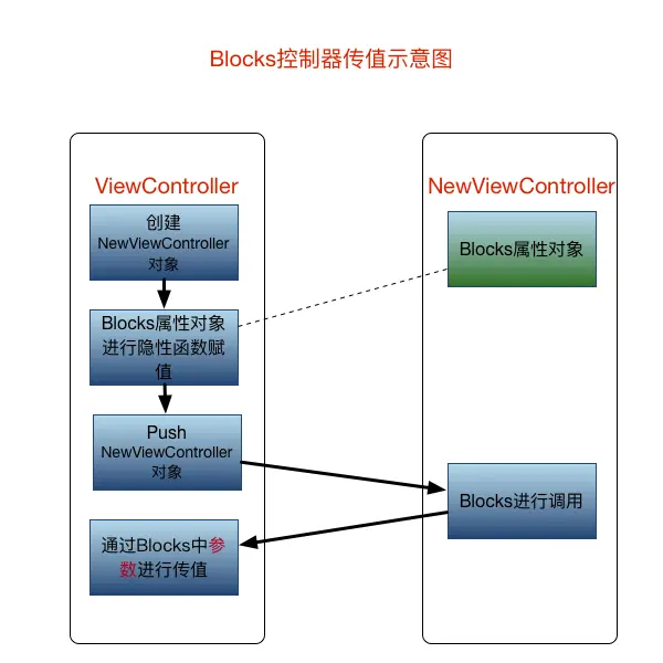 假设有两个控制器,一个是ViewController对象,另外一个是NewViewController对象;其中,NewViewController对象是通过ViewController对象pushViewController推出来的,我们的目的是通过在NewViewController进行操作,然后给ViewController进行传值操作.示意图如下所示.