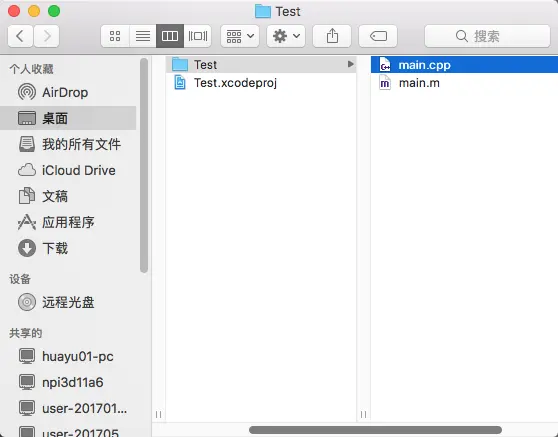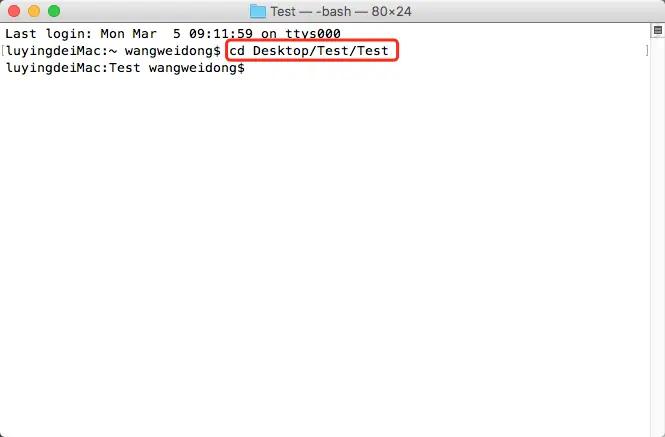 - 打开终端,使用cd指令进入需要转化的文件目录下,比如我要对桌面上的Test工程下的main.m文件进行转化.终端指令类似于下图所示.