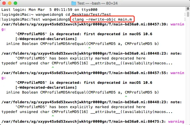 - 然后执行如下的终端命令 clang -rewrite-objc main.m,如下所示.