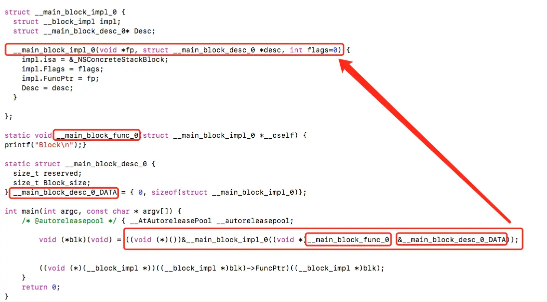 我们去掉转化部分.简化代码之后如下所示.这句代码是什么意思呢?这就是使用函数的指针调用函数.正如我们刚刚所示的一样.正如上一个模块所说的那样,___main_block_func_0的函数指针被赋值到了结构体的FuncPtr中了.另外___main_block_func_0的所需参数是__main_block_impl_0的类型,也就是blk.所以有以下的函数调用.