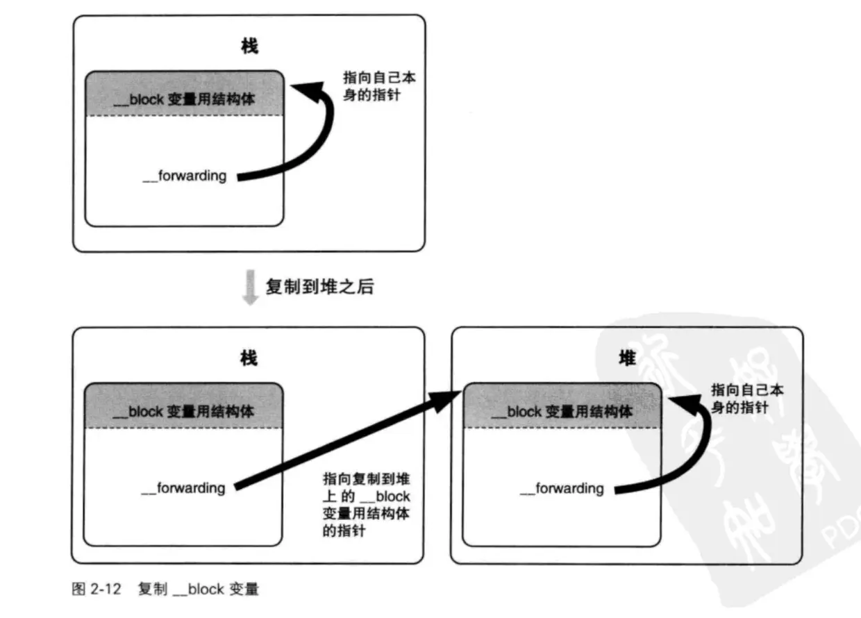 - 如果有多个Block使用某个__block变量,那么在第一个Block中__block变量会从栈复制到堆并被第一个Block持有.从第二个Block时是持有__block变量,也就是只会增加__block变量的引用计数.
