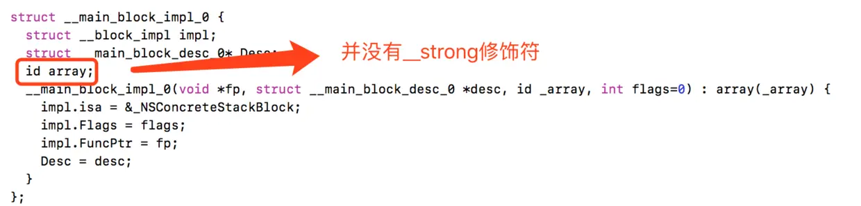 可是我在实际过程中并没有**__strong**修饰词.个人猜想是已经进行了缺省操作了.省略了__strong的修饰符.源码截图如下所示.大家可以自行试验操作.