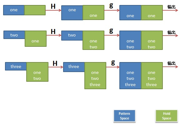 g: 将hold space中的内容拷贝到pattern space中,原来pattern space里的内容清除