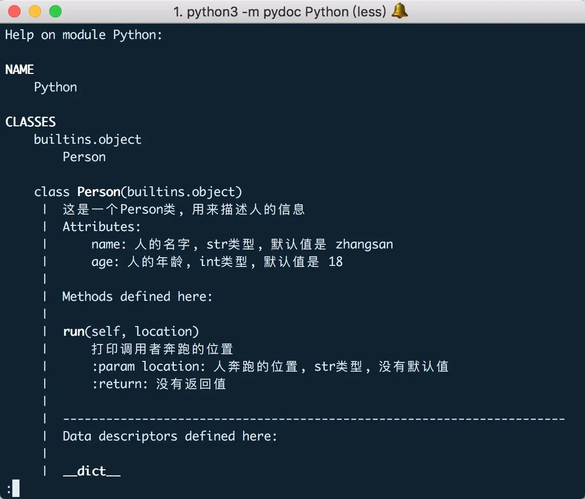 python3 -m pydoc Python, 来查看整个模块中的文档描述