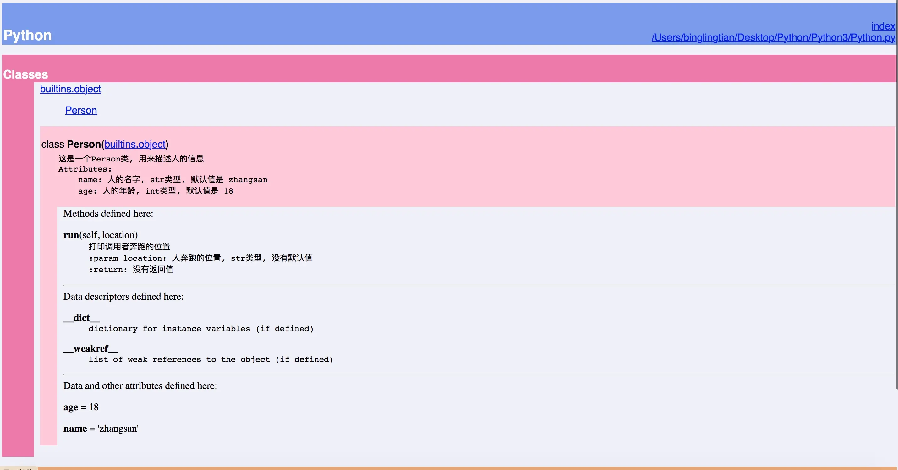 - 使用浏览器打开Python.html文件, 可以查看网页版的文档描述