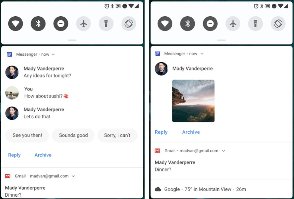 △ 在 MessagingStyle 通知中,您可以显示对话和智能回复 (左图),甚至添加图片和表情 (右图)。