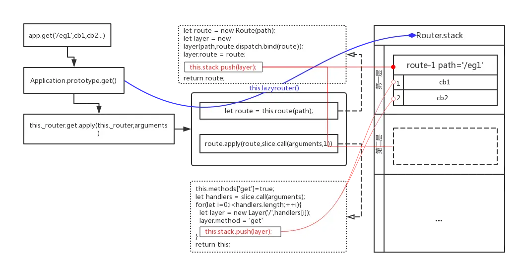 无非就是在调用.route()方法的时候返回我们的route(route.stack里的一层),这样再调用.get等其实就是调用Route.prototype.get等了,就能够顺利往这一层的route里添加不同的callbcak了。