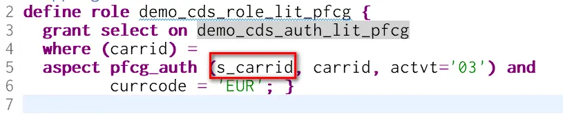 比如下图这个ABAP development studi里创建的角色是为了实现CDS view DEMO_CDS_AUTH_LIT_PFCG的权限控制,里面使用到了权限对象S_CARRID.