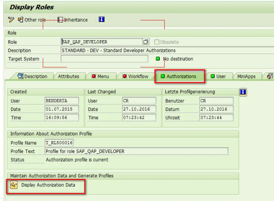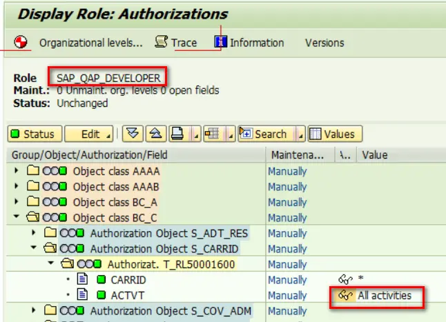 上图意味着如果一个用户被分配了PFCG角色SAP_QAP_DEVELOPER,这个用户就拥有了权限对象S_CARRID上定义的Create,Change和Display的权限: