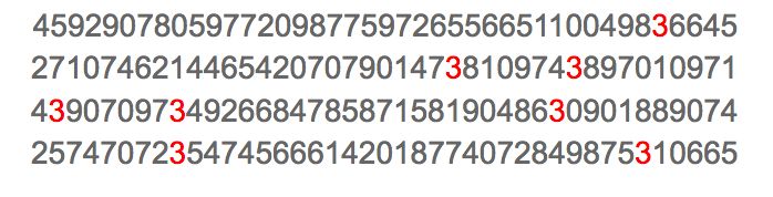 这很困难,需要很多有意识。您可能必须按顺序扫描所有数字。但如果我们改变一个Preattentive属性,色调,它变得更容易: