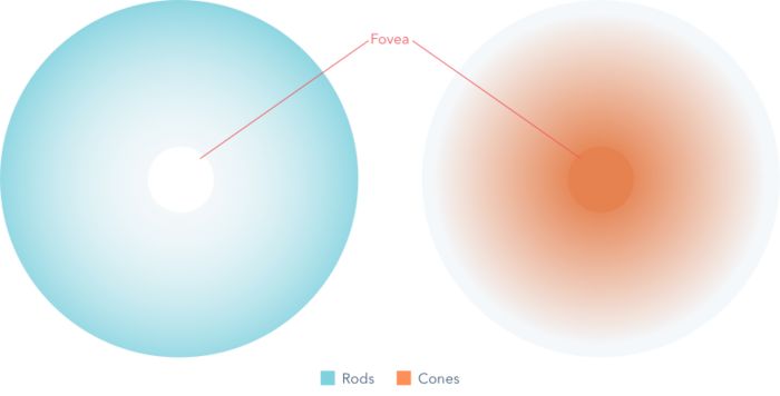 视锥大约是视杆的20倍,也是专门用于细节和色彩视觉的细胞。中心凹处充满了锥体。但锥体也具有敏锐的方向感,并且在弱光下不太好。激活锥体需要更多的光子。