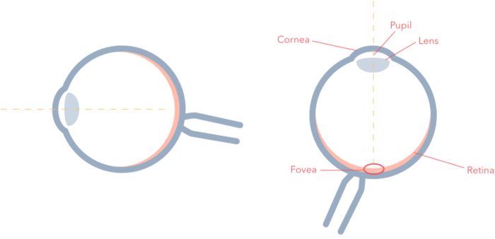 光线通过瞳孔进入你的眼球,并在背面接触到约一亿三千万个称为视网膜的特定细胞层(沿着各种流体和血管行进)。在视网膜中有两种类型的细胞,其名称基于它们的形状:杆状和圆锥状。在视网膜的正中央是中央凹。中央凹是一个重要的结构,因为它是光线最直接照射到的地方。请记住:中央凹就是焦点。