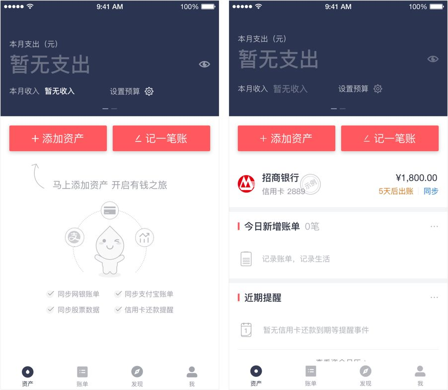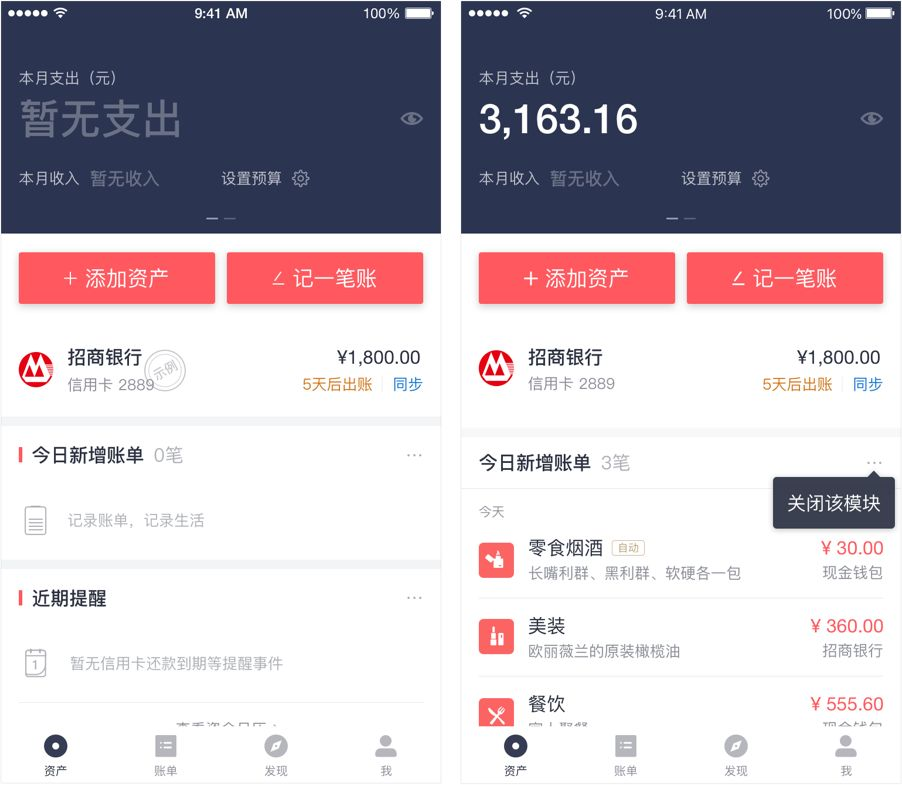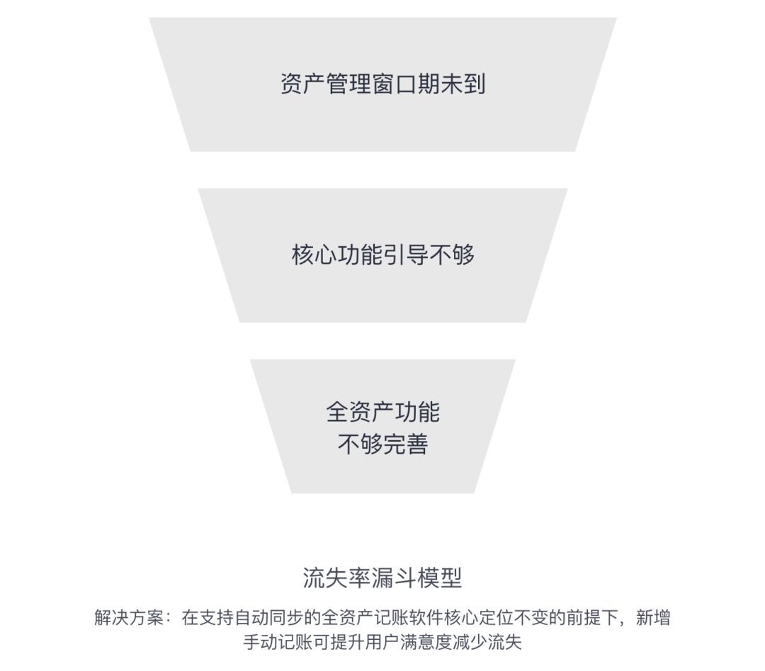 用户引导策略:产品功能层面加强添加资产和记账引导,利用有限的空白空间交互告诉用户不止可以添加资产,还可以手动记账。