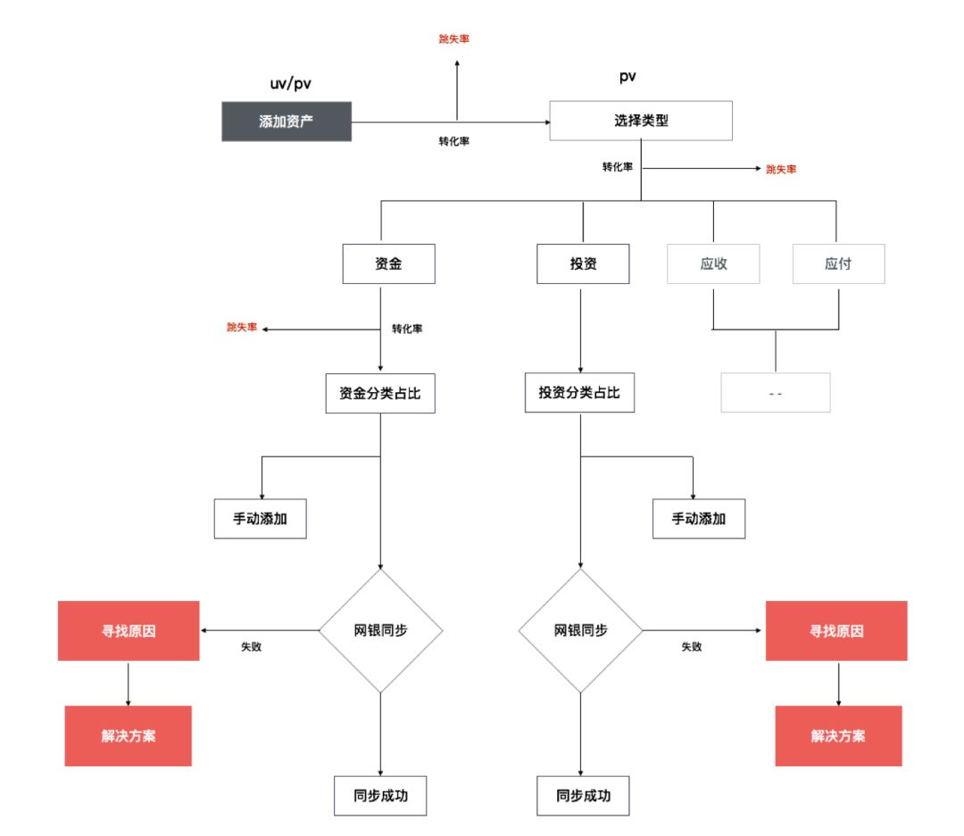 例:添加资产流程全链路埋点“添加资产btn—资产选择list—账户登录—成功添加资产账户