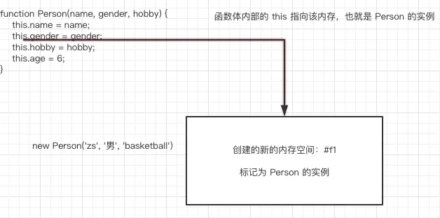 由于函数体内部的 this 指向新创建的内存空间,默认返回 this ,就相当于默认返回了该内存空间,也就是上图中的 #f1。此时,#f1的内存空间被变量 p1 所接受。也就是说 p1 这个变量,保存的内存地址就是 #f1,同时被标记为 Person 的实例。