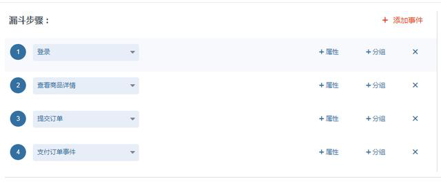 可添加事件,每个事件可设置不同的属性筛选条件,最多添加10个步骤,如下图则添加了一个购买商品漏斗流程