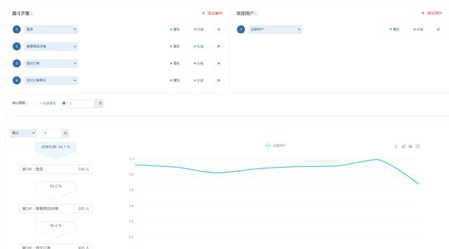 漏斗帮您分析用户使用过程中每一步的转化率与流失率,例如用户在互联网金额注册时,有如下几步