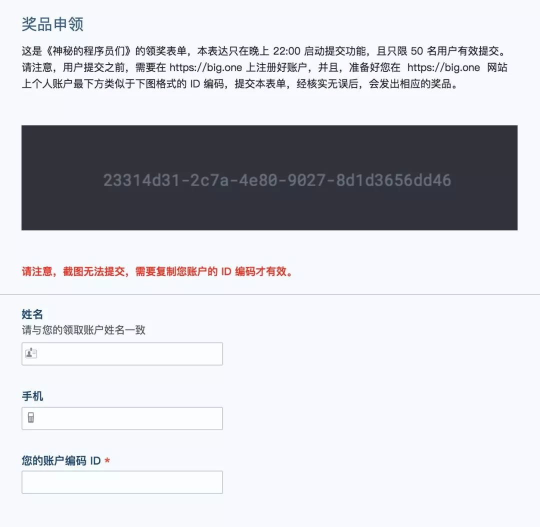 表单会在今天北京时间晚上22:00开放,50份,先 到 先 得! 开抢前别忘了 提前到 https://big.one/ 注册好帐号,拿到账户ID才可以参与抢币。使用方法请见 https://help.big.one/hc/zh-cn/articles/115003477334-What-is-Account-ID-How-Can-I-Find-It-