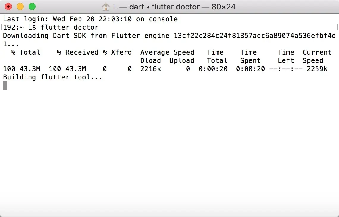 第一次运行 flutter 命令 如( flutter doctor ), 会自行开始下载依赖库并编译. 后续的运行就会变的快的多.