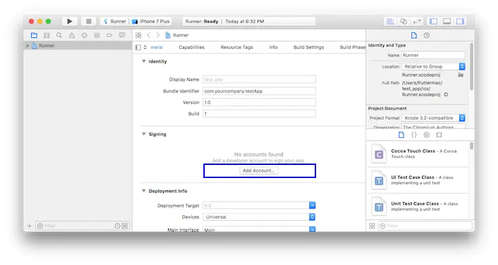 Runner项目 Runnertarget设置页面 , 确保在General > Signing > Team下的开发团队是被选中的. 当选择一个团队 , Xcode会创建并下载开发证书 , 并账号中注册此设备 , 然后创建并下载一个描述文件.