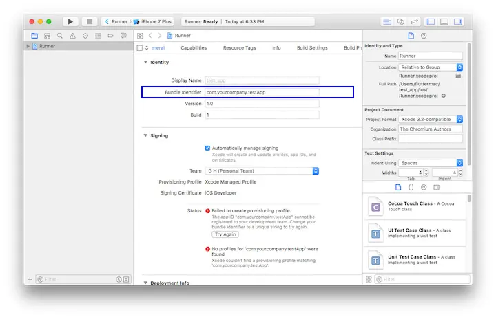 若 Xcode中的自动签名失败 , 请验证项目中的General> Identity> Bundle Identifier下的值是否唯一