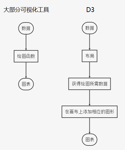 D3 相对来说较底层,对初学者来说不太方便,但是一旦掌握了,就比其他工具更加得心应手。下图展示了 D3 与其它可视化工具的区别: