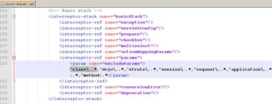 这是S2-020的利用,我们再回到S2-021,首先看一下官方是怎么修复的,找到struts2-core-2.3.16.1.jar中的struts-default.xml,可以看到官方修复就是将用户请求用正则过滤了一下,而且正则写的也很简陋,包括github上给出的那个修复方法,都没有过滤掉真正的利用,如图所示: