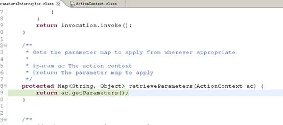这里其实调用ActionContext.getParameters()实现,获得Map型的参数集parameters。遍历 HttpServletRequest、HttpSession、ServletContext 中的数据,并将其复制到Webwork的Map中实现,至此之后,所有数据操作均在此Map结构中进行,从而将内部结构与Servlet API相分离。