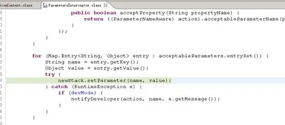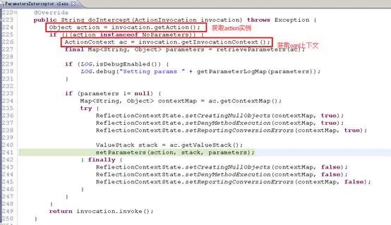 其实Struts2的核心就是一个Filter,它的作用只是处理HTTP请求(request)然后返回给客户端(response),其doFilter方法是struts2处理HTTP请求的入口。后面struts2将HTTP请求经过一系列处理之后,交给了参数拦截器(ParametersInterceptor),用来设置参数属性。前面我们提到的用户提交aa=bb这样的请求时struts2会自动执行对应setaa方法去设置这个属性值,其实都在参数拦截器的逻辑中,但是具体实现是靠OGNL完成的。参数拦截器有一个doIntercept方法,如图