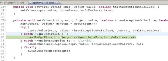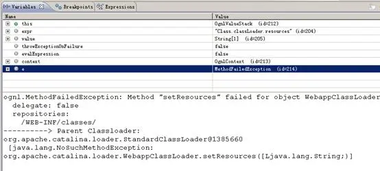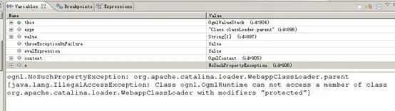 这里其实并没有setparent,WebappClassLoader.java中也没有setparent这个方法,这里报错应该是因为OGNL没有权限访问WebappClassLoader的parent也就是URLClassLoader所以抛出错误。