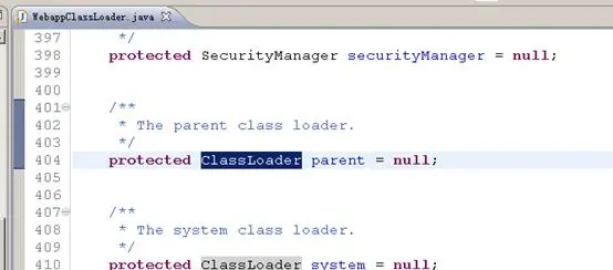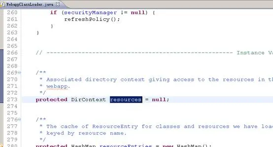 这里经过我测试,发现可以用class.classLoader.parent和class.classLoader.resources这两个属性,首先对于tomcat这个两个属性覆盖全版本,再就是他们有对应的set方法,最后也就是最重要的,覆盖不成功,使框架抛出错误。这里我查了一下在tomcat源码中对这两个属性的定义,如图