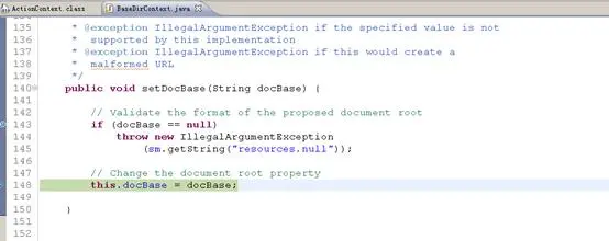 因为每个action必然继承容器的classLoader,所以每个action中肯定有对应classLoader中的属性。这里请求参数是Class['ClassLoader'].resources.dirContext.docBase,跟踪代码最终找到调用的是tomcat源码中BaseDirContext类中的setDocBase()方法,如图