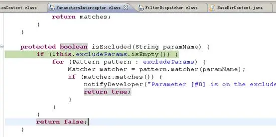 这里再说一下官方修复为什么会被绕过,还是看参数拦截器的代码(ParametersInterceptor.java),他会调用isExcluded去检测请求参数是否合规,如图