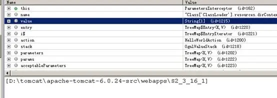 这里我就以Class['ClassLoader'].resources.dirContext.docBase =aa为例跟踪请求从tomcat容器到struts2框架的代码处理流程,先说一下调试环境,这里我debug的是tomcat 6.0.24的源码+struts2.3.16.1的源码。