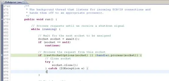 首先肯定是先由tomcat来处理请求,跟踪tomcat源码,这里tomcat调用JIoEndpoint.java的run()创建socket