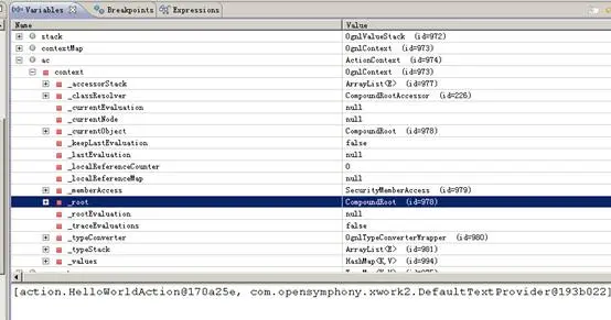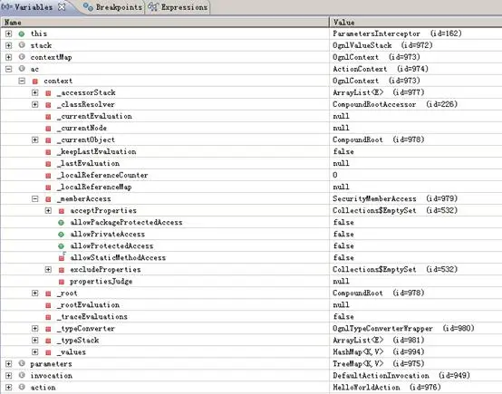 其实ac里存的就是contextMap,在这里我们可以看到一些比较熟悉的内容,比如#_memberAccess.allowStaticMethodAccess这个在之前的利用中多次出现,再就是#_root这个是根元素ValueStack,它保存的是action的实例,如图