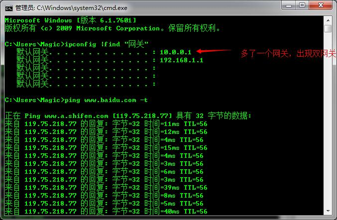 因为出现双网关现在所以并未像官网演示的那样流量直接走向恶意网关(10.0.0.1)而是依旧走的之前的网关(192.168.1.1)故劫持失败。在删除之前的网管后才生效。本帽觉得可以结合下文的HID Keyboard Attack先设置一个定时脚本执行对路由表的操作(删除原网关)。