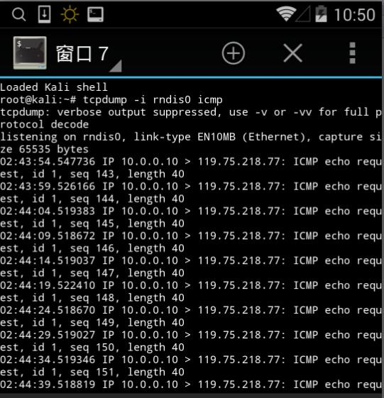 tcpdump监听(默认tcpdump是被精简了的,需要自己上传一个。或者进入kali shell)执行tcpdump -i rndis0 icmp