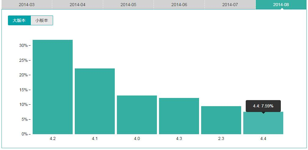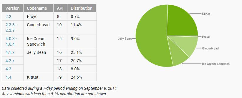 的确漏洞产生的原因是因为kitkat(android 4.4)之前webview组件使用webview内核而遗留的漏洞。使用最新的android系统当然安全性要更高而且运行更流畅,但是有多少人能升级或者使用到相对安全的android版本了。下图来自谷歌官方2014.09.09的统计数据。