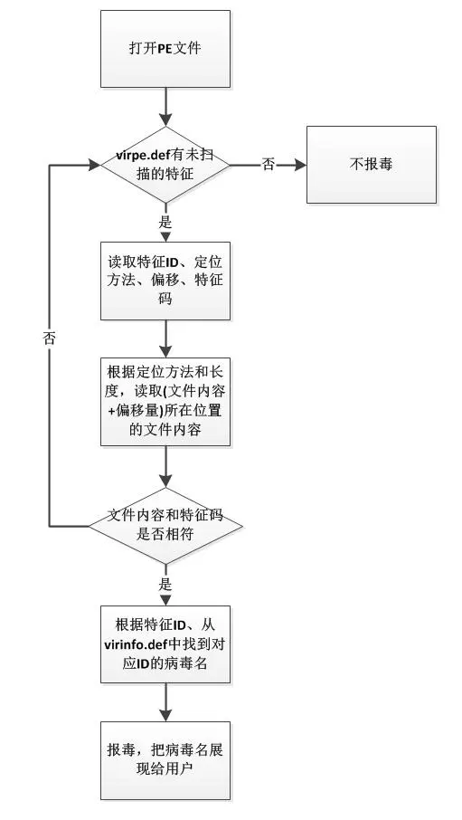 将数十字节的病毒代码二进制,记录在病毒库中,与待检测样本进行全文匹配。