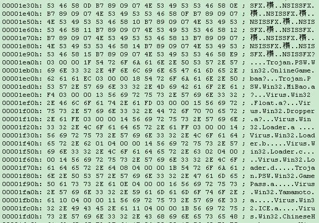 将恶意程序的明显字符串信息提取出,记录在病毒库中,与待检测样本进行多模匹配。