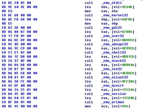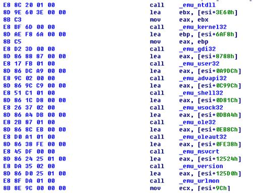 模拟了ntdll、kernel32、gdi32、user32、advapi32、shell32、wsock32、ole32、oleaut32、msvcrt、version、urlmon这几个系统DLL