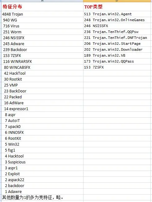 特征数量整体非常少,以PE为例只有8135条特征。分布见下图。从特征分布和类型来看,TAV主要查杀目标为外挂、盗号程序。对于动辄百万级规模的恶意程序家族其实只覆盖了冰山一角,远远达不到一个杀毒引擎的程度,仅仅停留在外挂、盗号专杀的层面。更让人捉急的是TAV维护了大量的脱壳解包特征,直接暴露了开发者框架设计方面的缺陷。与此形成鲜明对比的是国际知名的卡巴和BD引擎,通常在一个“膨胀”的过程中,维护较多的同家族特征,随后再在“收缩”过程中,用一条obj通杀,显得章法自如、张弛有度。