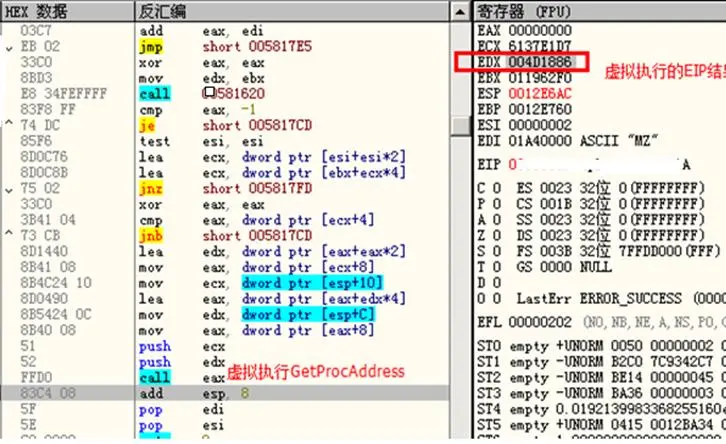 当文件被加UPX壳后,会调用GetProcAddress动态获得API地址,TAV可以模拟GetProcAddress的结果,并且可以执行到下一条EIP所在位置,使得程序能够正常模拟下去,而不至于触发异常返回。