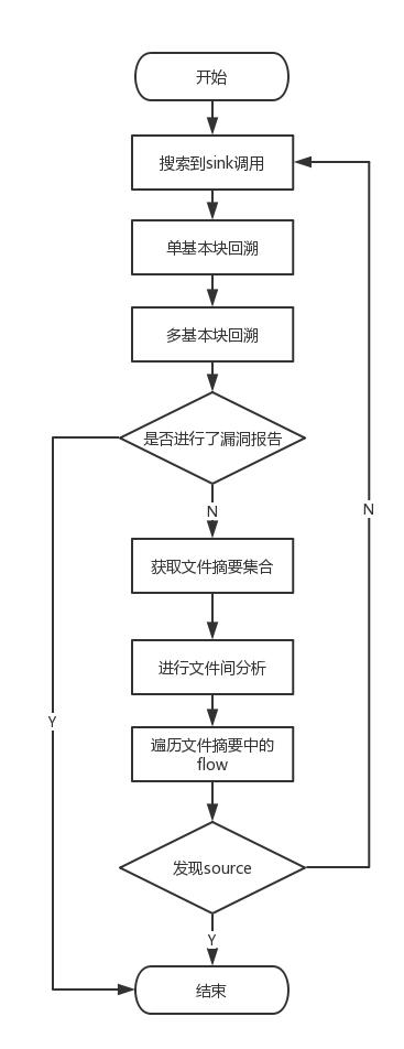 编译前端的工作中,如果发现敏感函数的调用,就停下来进行污染传播分析,进行过程间分析、过程内分析,找到对应的污点数据。然后基于数据流分析过程中搜集的信息,进行净化信息和编码信息的判断,从而判断是否为漏洞代码。